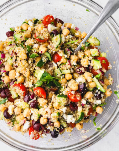 This chopped Mediterranean quinoa salad is packed with crisp veggies, chickpeas, olives, and creamy View Recipe