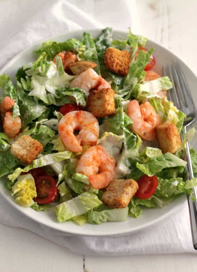 - To a large bowl, add lettuce, grape tomatoes, and Caesar dressing. Mix together. Top salad with shrimp, and serve with croutons, if desired.