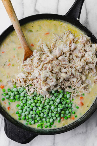 - Remove skillet from heat, and stir in shredded chicken, frozen peas, salt and pepper and gently fold to combine.