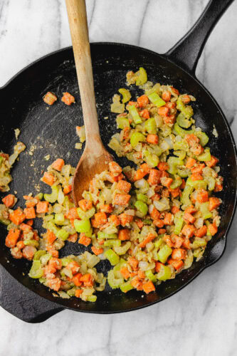 - In a 12-inch cast iron skillet, melt butter over medium heat. Add onion, carrot, and celery. Cook until veggies are soft and onion is translucent, about 5-6 minutes. Add minced garlic and thyme and saute until fragrant, 1 minute.