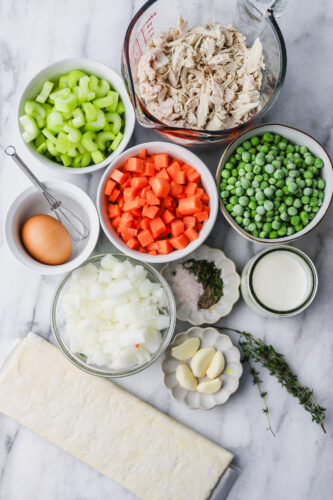 You can prep the filling up to 2-days in advance, just store covered in the fridge. When ready to bake, reheat the filling in the skillet, top with puff pastry and egg wash, and bake as directed.
