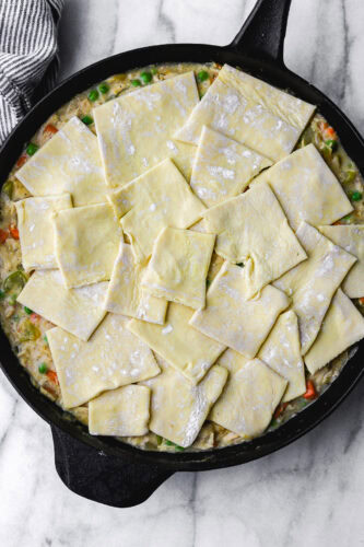 I love chicken pot pie so much. But I’m going to be 100% and just tell you I’m also lazy. I just have zero desire to make pie dough from scratch and wait 45 minutes for it to bake. The next best thing? A chicken pot pie in cast iron skillet, with flaky and delicious puff pastry on top!