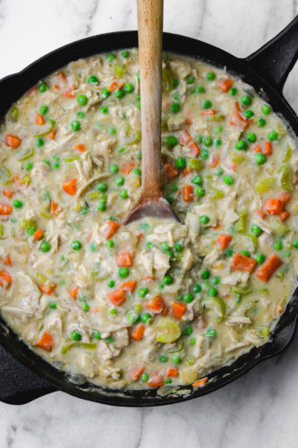 This Skillet Chicken Pot Pie is simple, cozy, and perfect for using up leftover rotisserie chicken or turkey breast. You can use any shredded or poached chicken you have on hand — it all works beautifully.