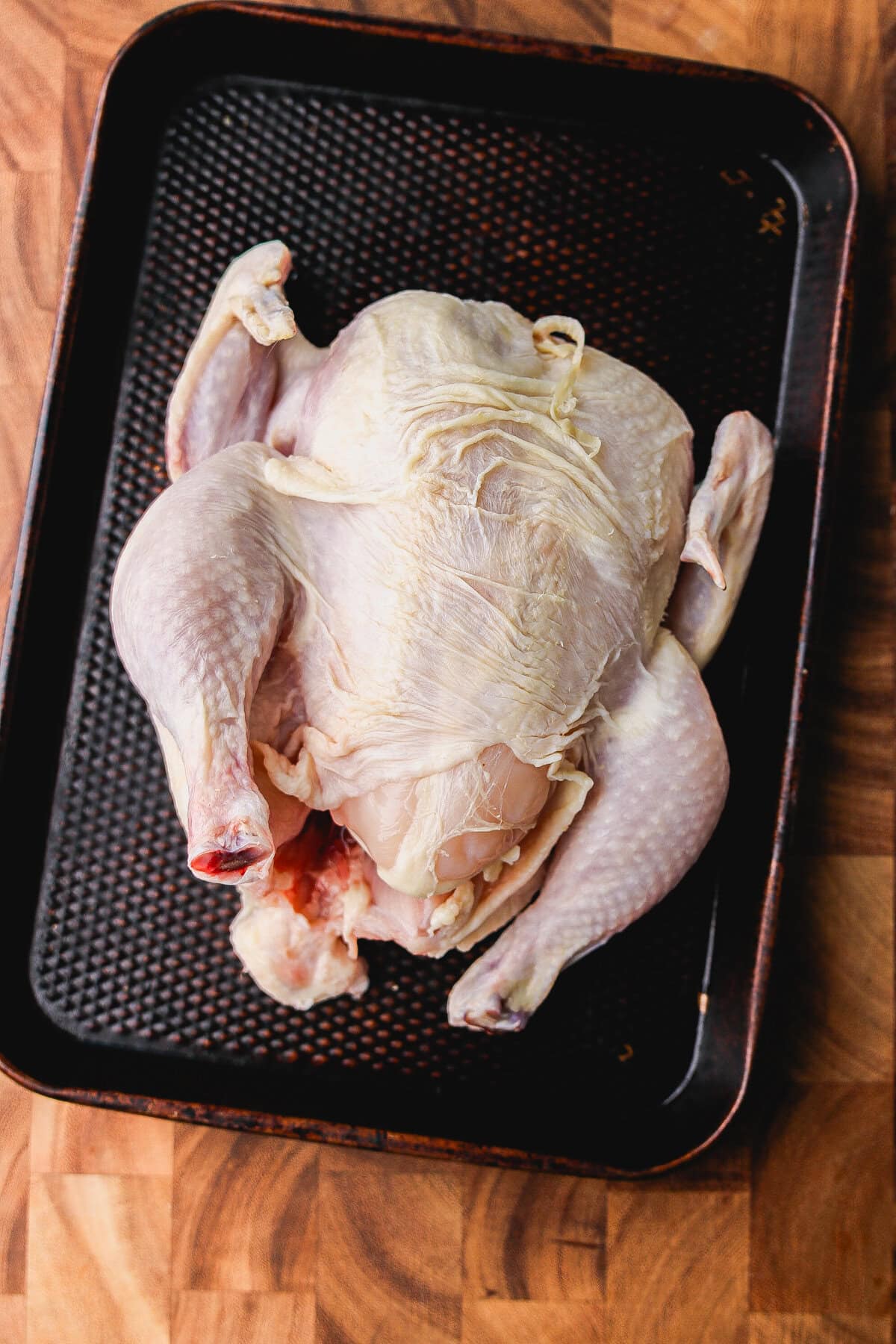 - Remove all parts from the chicken cavity (usually in a bag); rinse and pat dry with a paper towel.