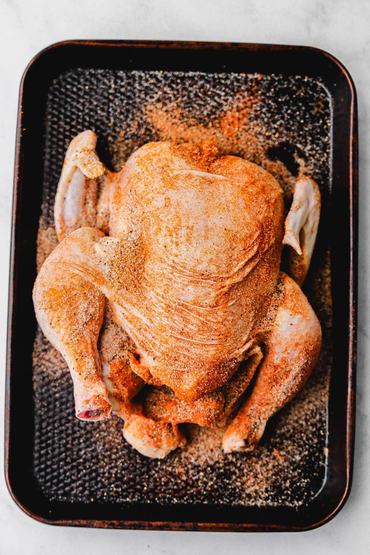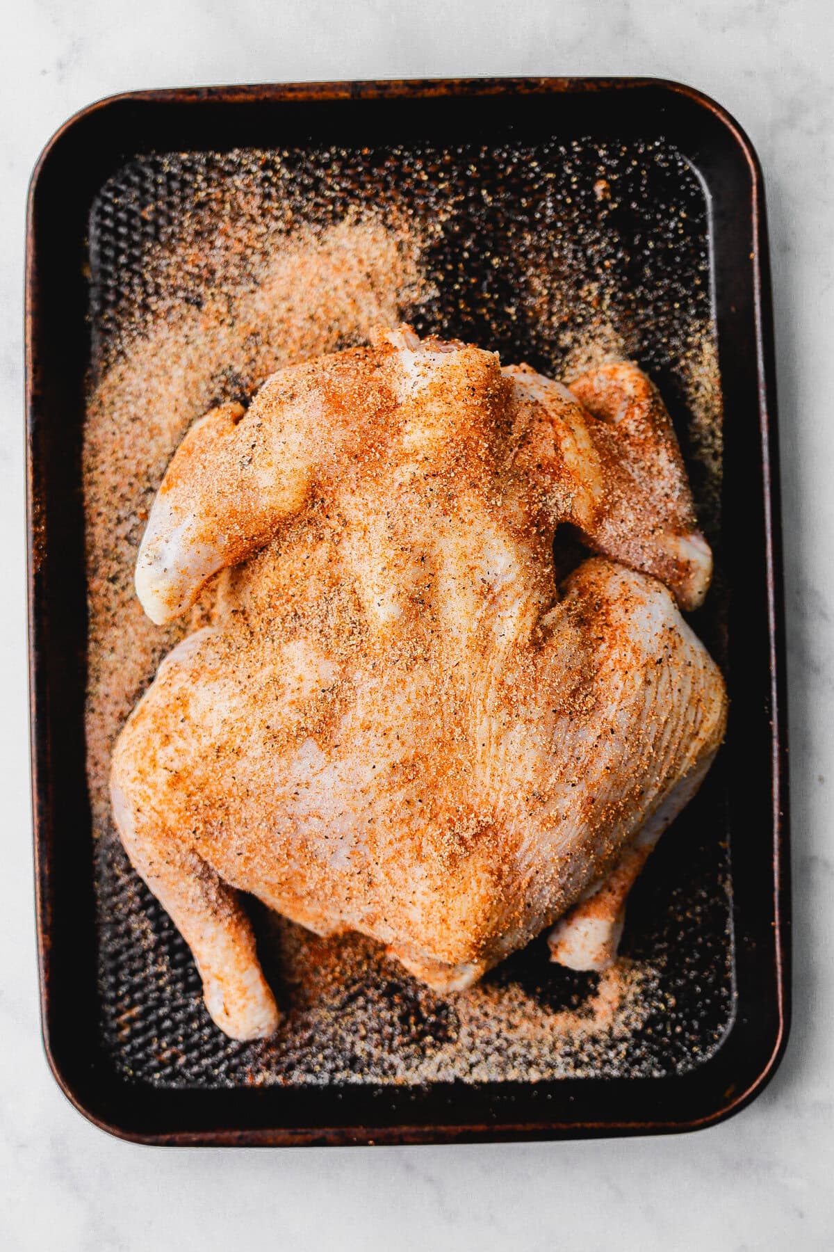 - Mix the remaining salt and pepper, paprika, garlic powder and onion powder together to create a spice rub. Coat half of mixture on the breast side of the chicken. Flip and season the other half of the whole chicken with the spice rub.