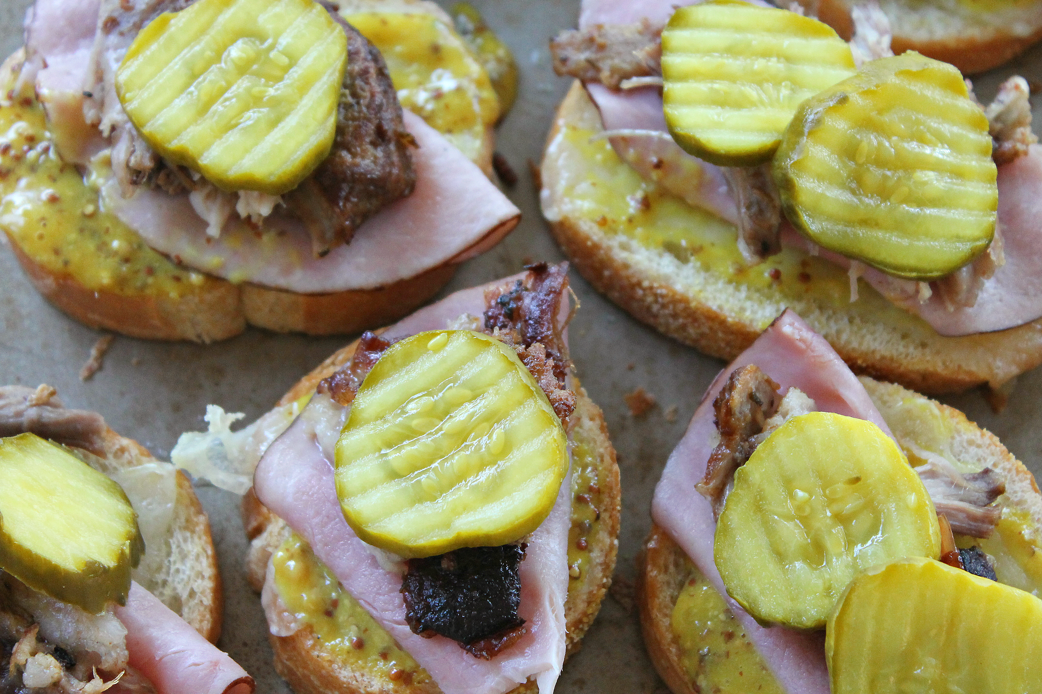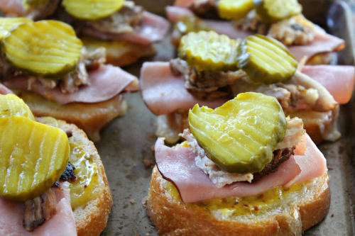 - Spread about 1/4 – 1/2 of a teaspoon mustard aioli on the top of the melted cheese. Top with piece of sliced ham [I rolled my in half]. Follow with a piece of Cuban pork. Place a single pickle slice on each crostini and serve!