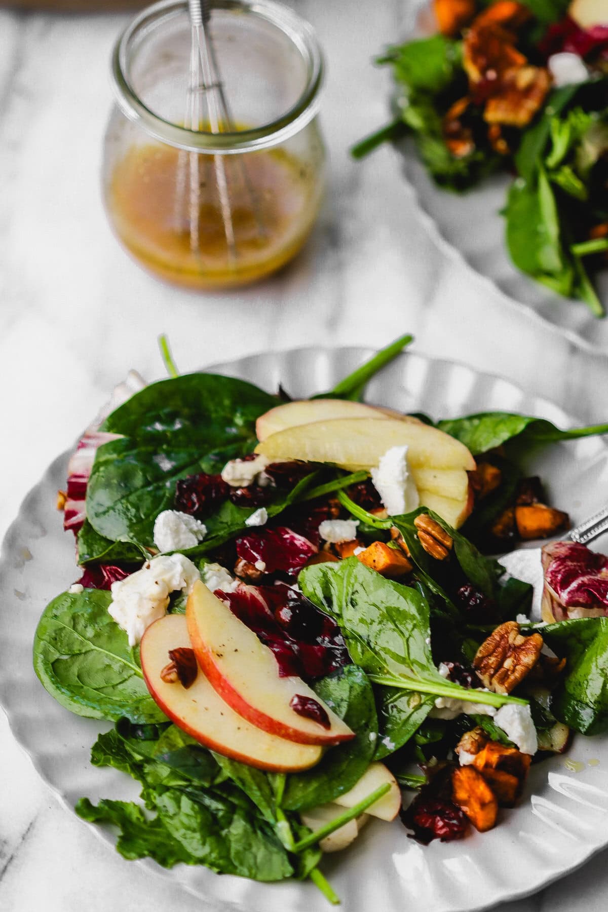 I love this maple mustard dressing with the crispy greens, sweet apples, soft sweet potatoes and tangy goat cheese. But you can also dress this salad with my apple cider vinaigrette if you prefer.