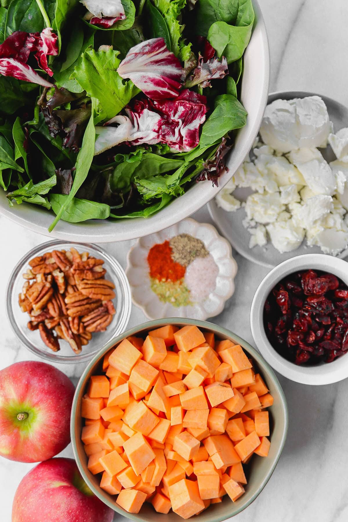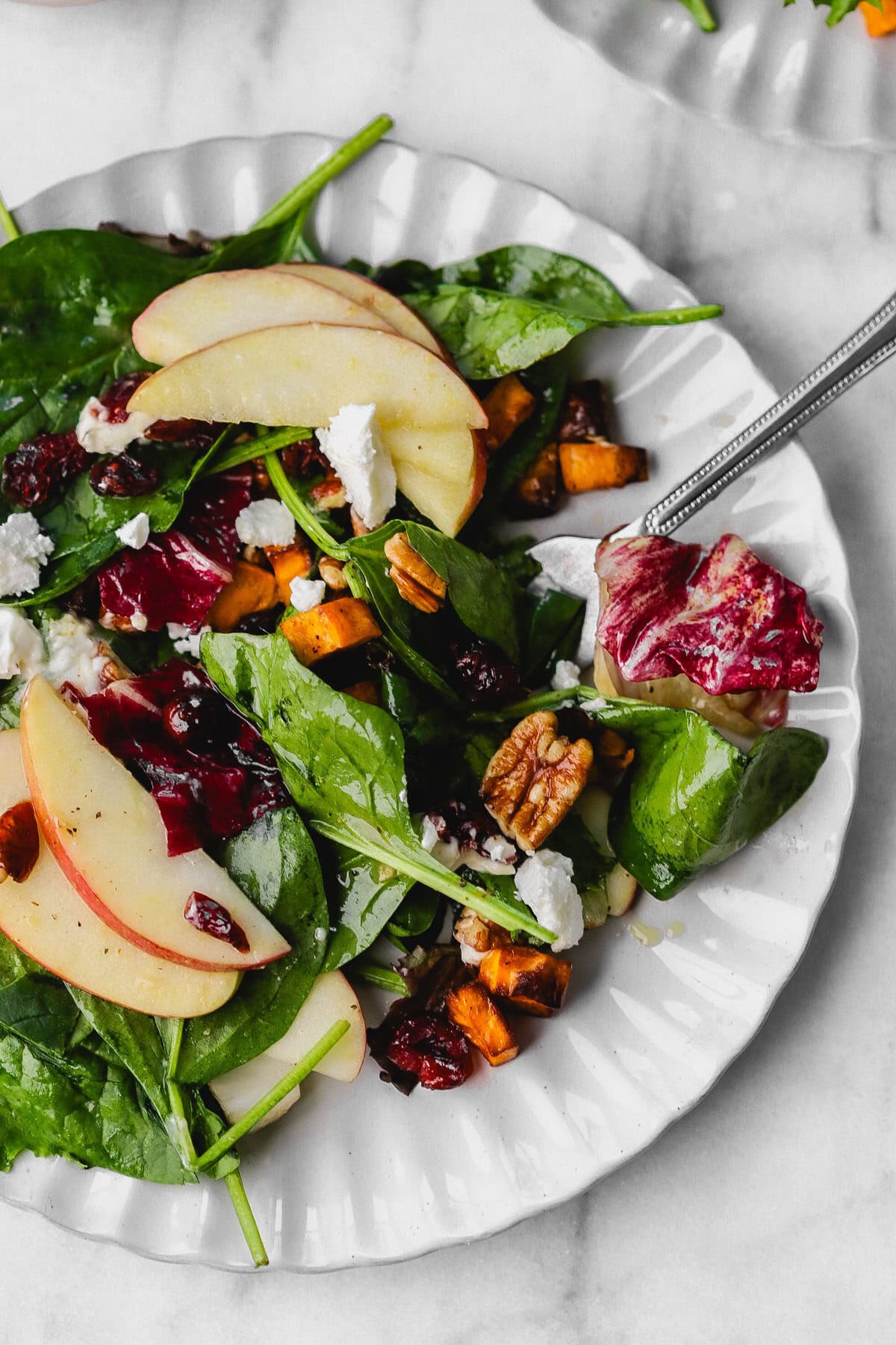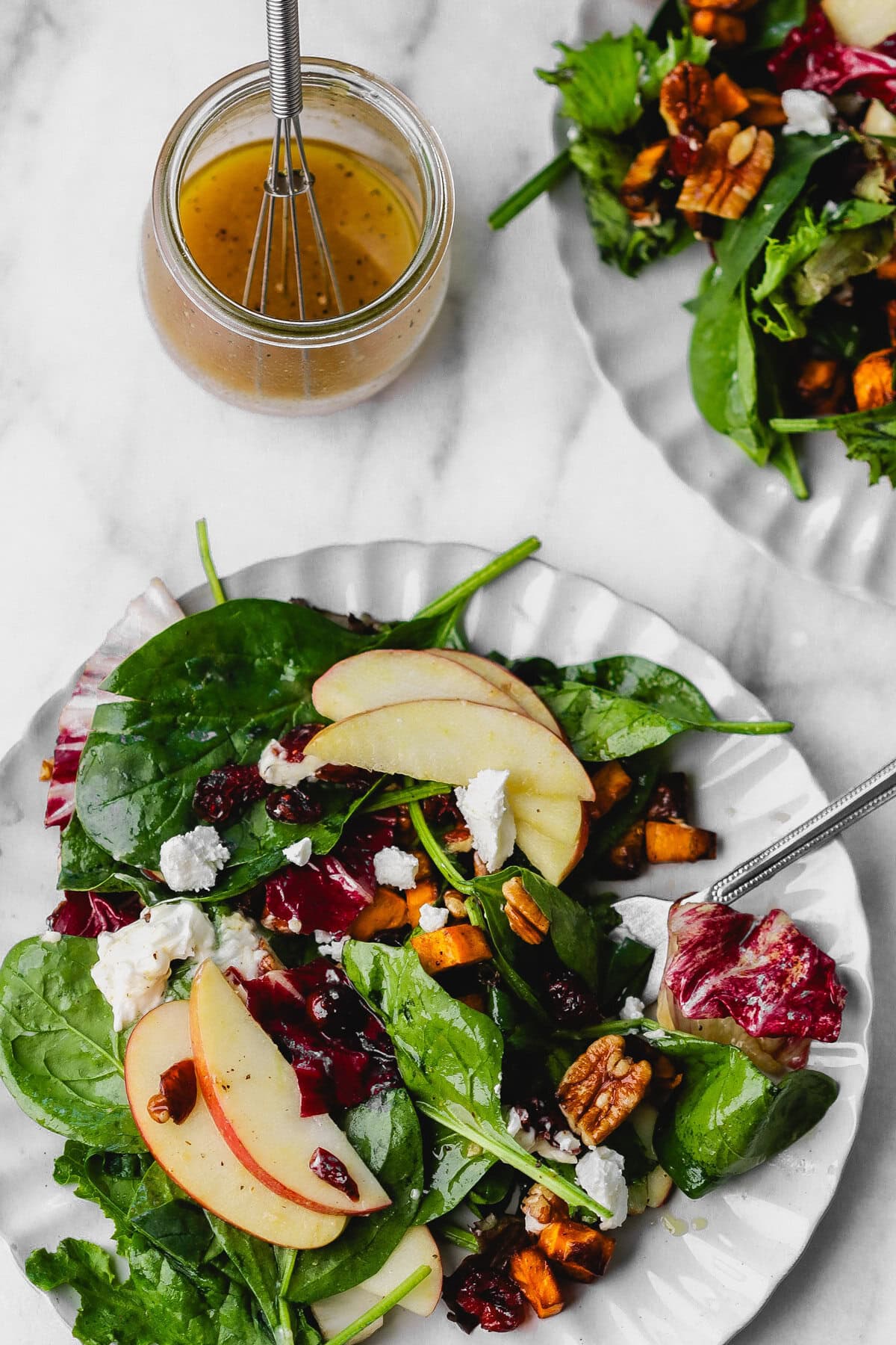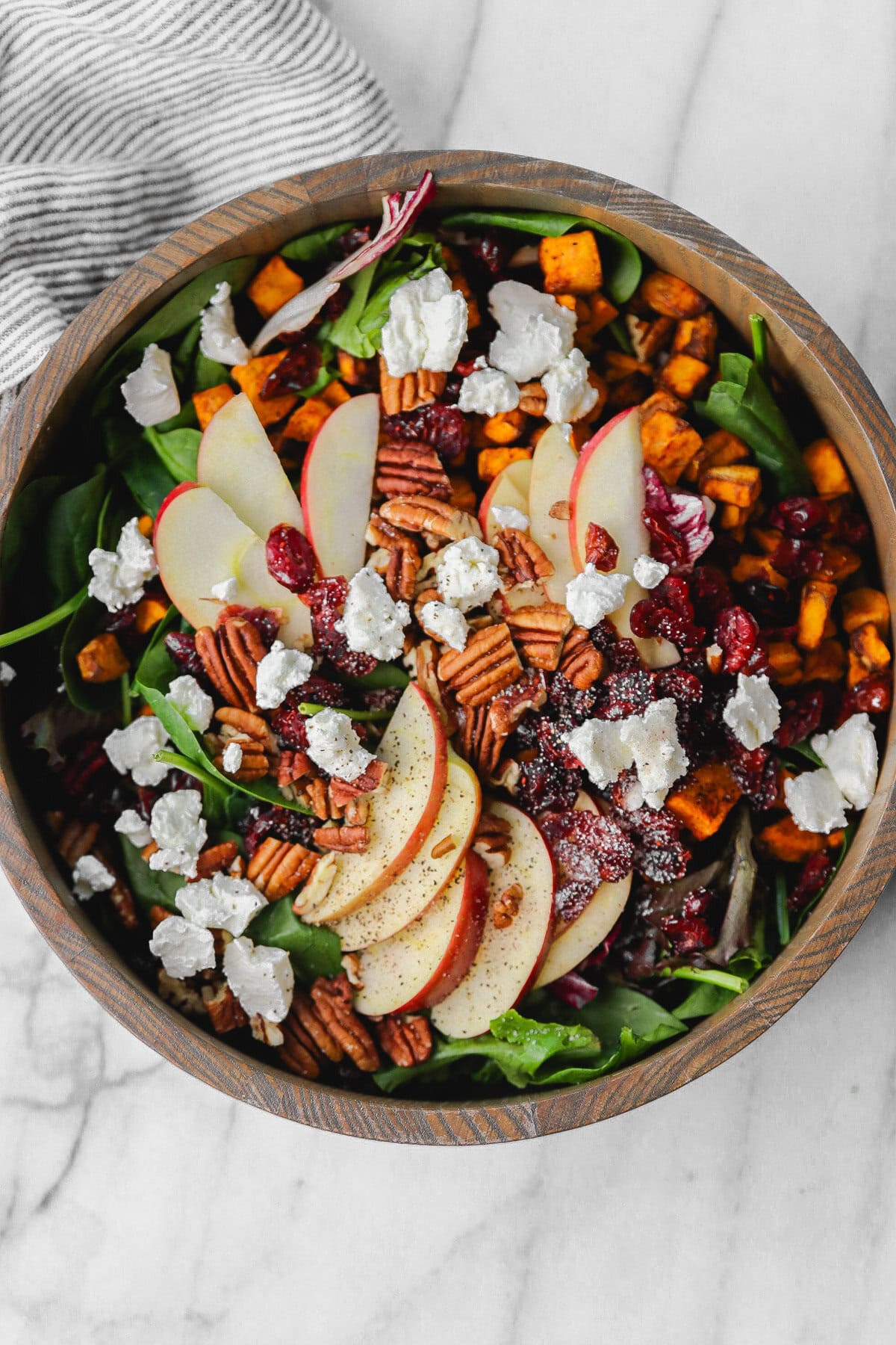 Yes! It’s easy to assemble your harvest salad in advance. You can wash and prep the greens, roast the sweet potatoes, and store everything in a large bowl in the fridge until you’re ready to serve. For the apples, either toss them in a little lemon juice to prevent browning, or wait to add them just before serving. I’d also hold off on adding the goat cheese and, of course, the dressing until it’s time to eat to keep the salad fresh and crisp.