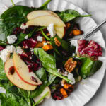 This harvest salad recipe combines roasted sweet potatoes, crisp apples, goat cheese, pecans, and cranberries tossed in a maple vinaigrette. A cozy fall salad that’s gluten-free, refined sugar-free, and full of flavor.