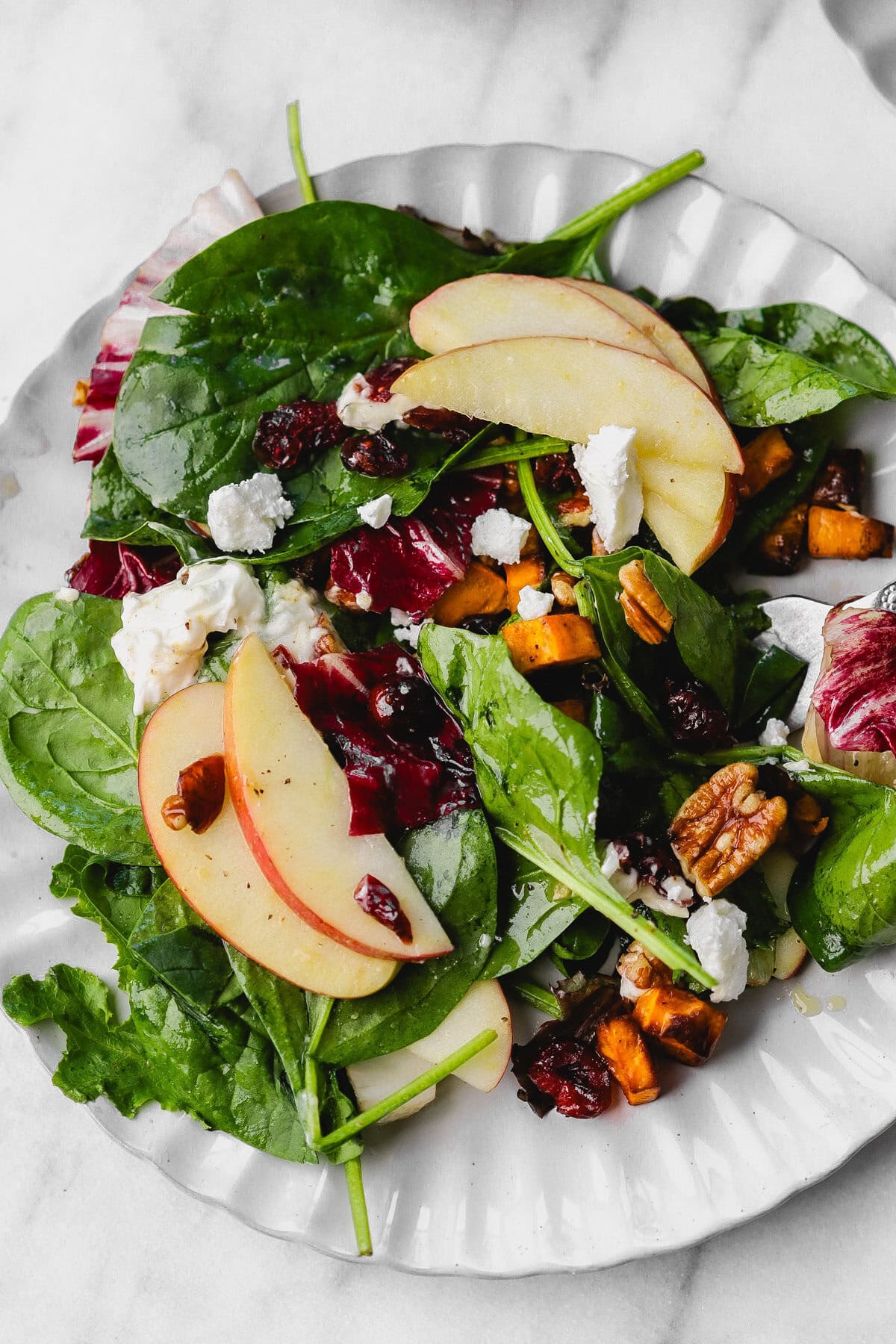 Yes! It’s easy to assemble your harvest salad in advance. You can wash and prep the greens, roast the sweet potatoes, and store everything in a large bowl in the fridge until you’re ready to serve. For the apples, either toss them in a little lemon juice to prevent browning, or wait to add them just before serving. I’d also hold off on adding the goat cheese and, of course, the dressing until it’s time to eat to keep the salad fresh and crisp.