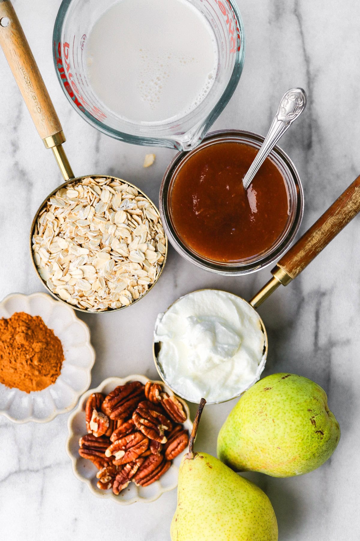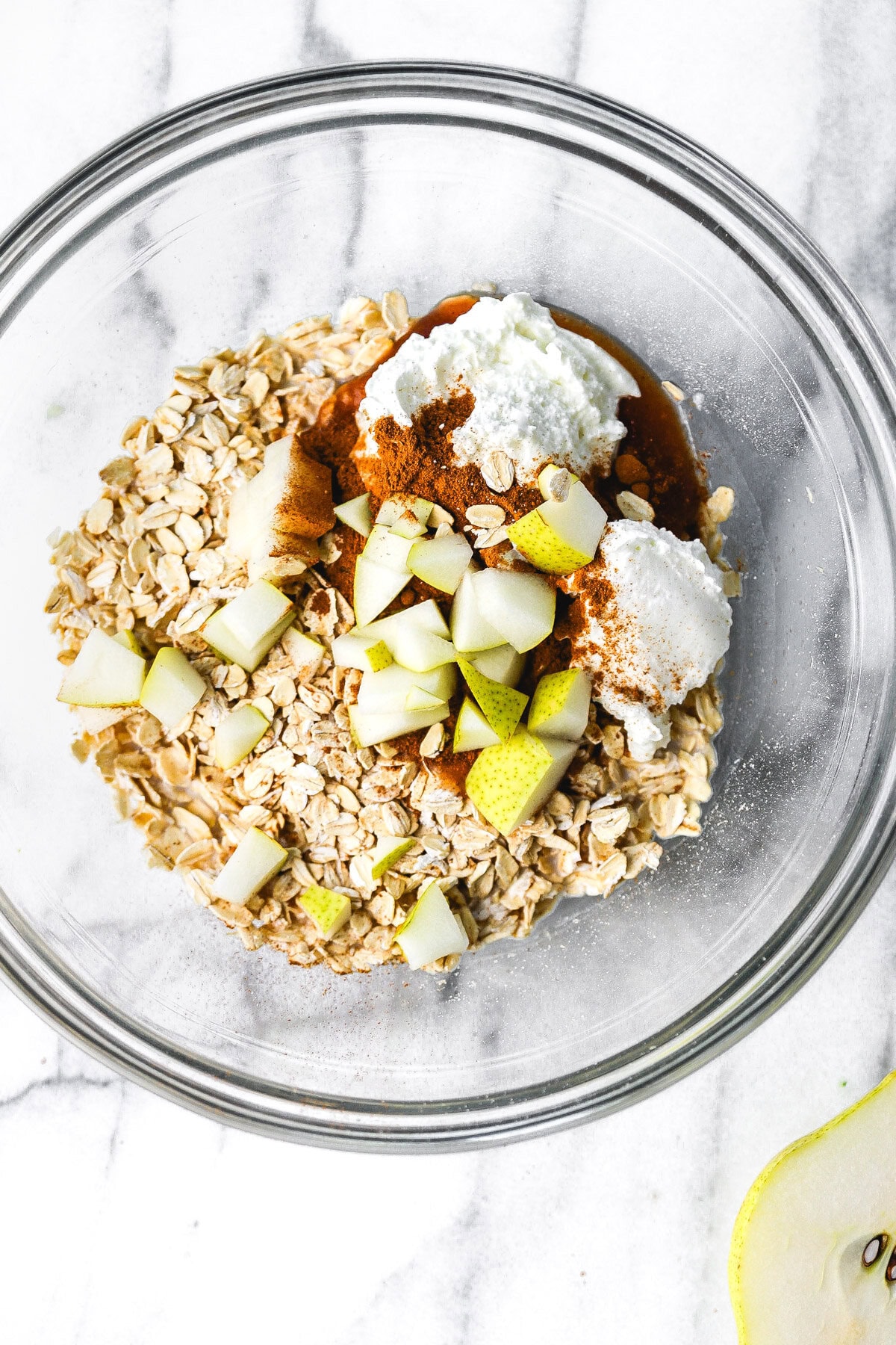- To a mixing bowl, combine rolled oats, almond milk, Greek yogurt, pear butter, spices, and chopped pear. Mix well to combine.