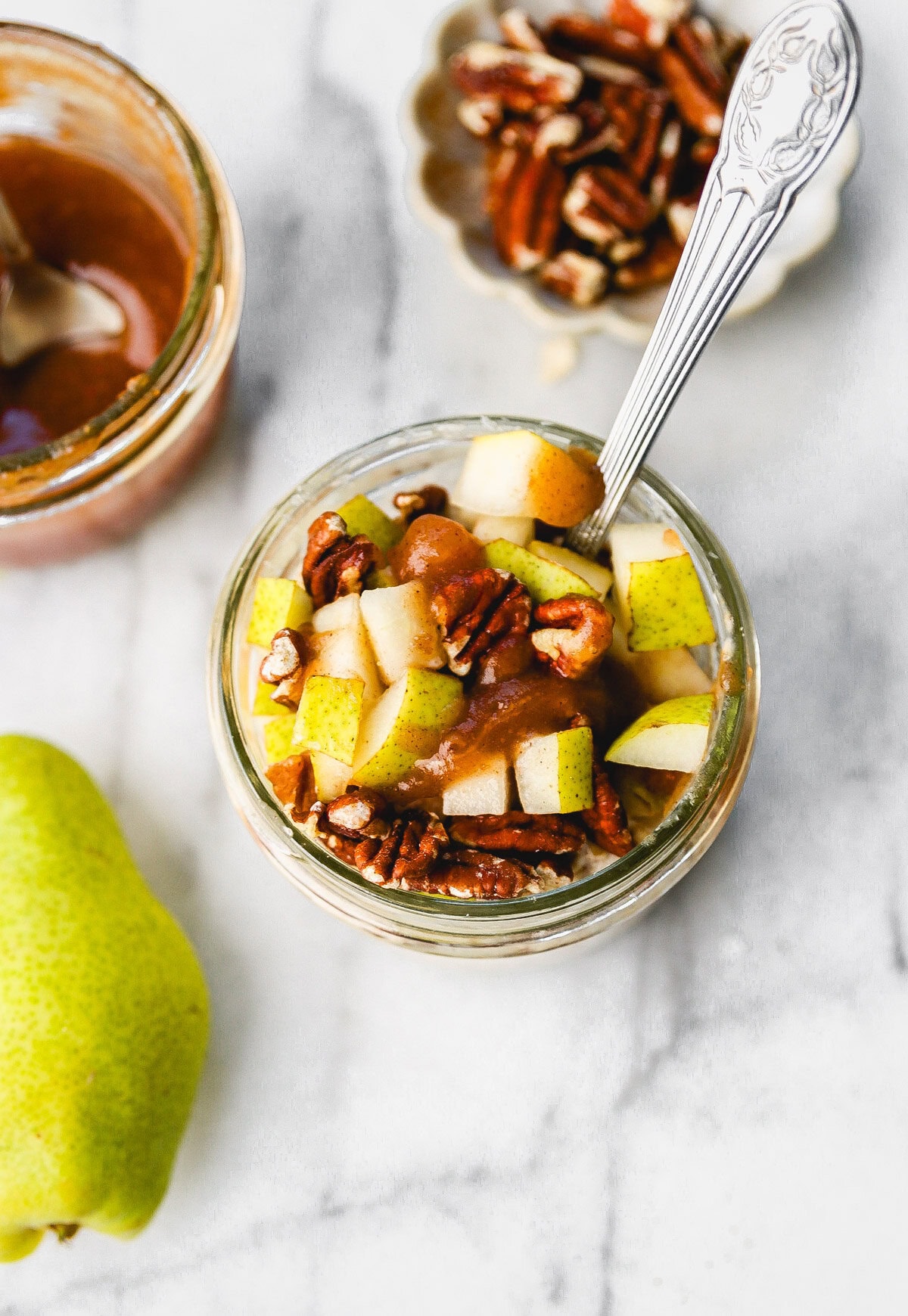 I just don’t feel like pears get enough love in the fall. But I love them in these overnight oats: packed with fiber, soft, sweet flavor and they pair with so many cozy spices like cinnamon, ginger, cloves, etc.