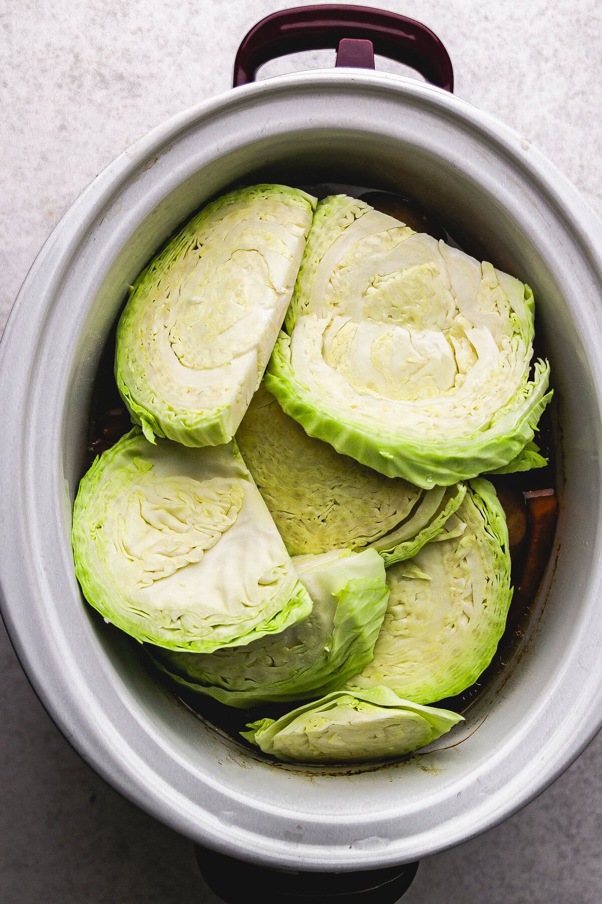- Add the cabbage. About 2 hours before serving, add cabbage wedges to the slow cooker, cover and continue cooking until the corned beef is fork-tender.