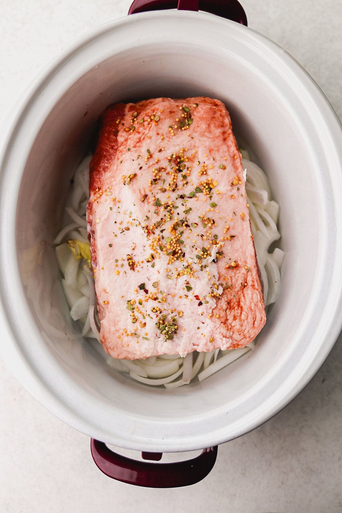 - Place the corned beef brisket, fat side up, over the onions. Top with pickling spice that came with brisket.