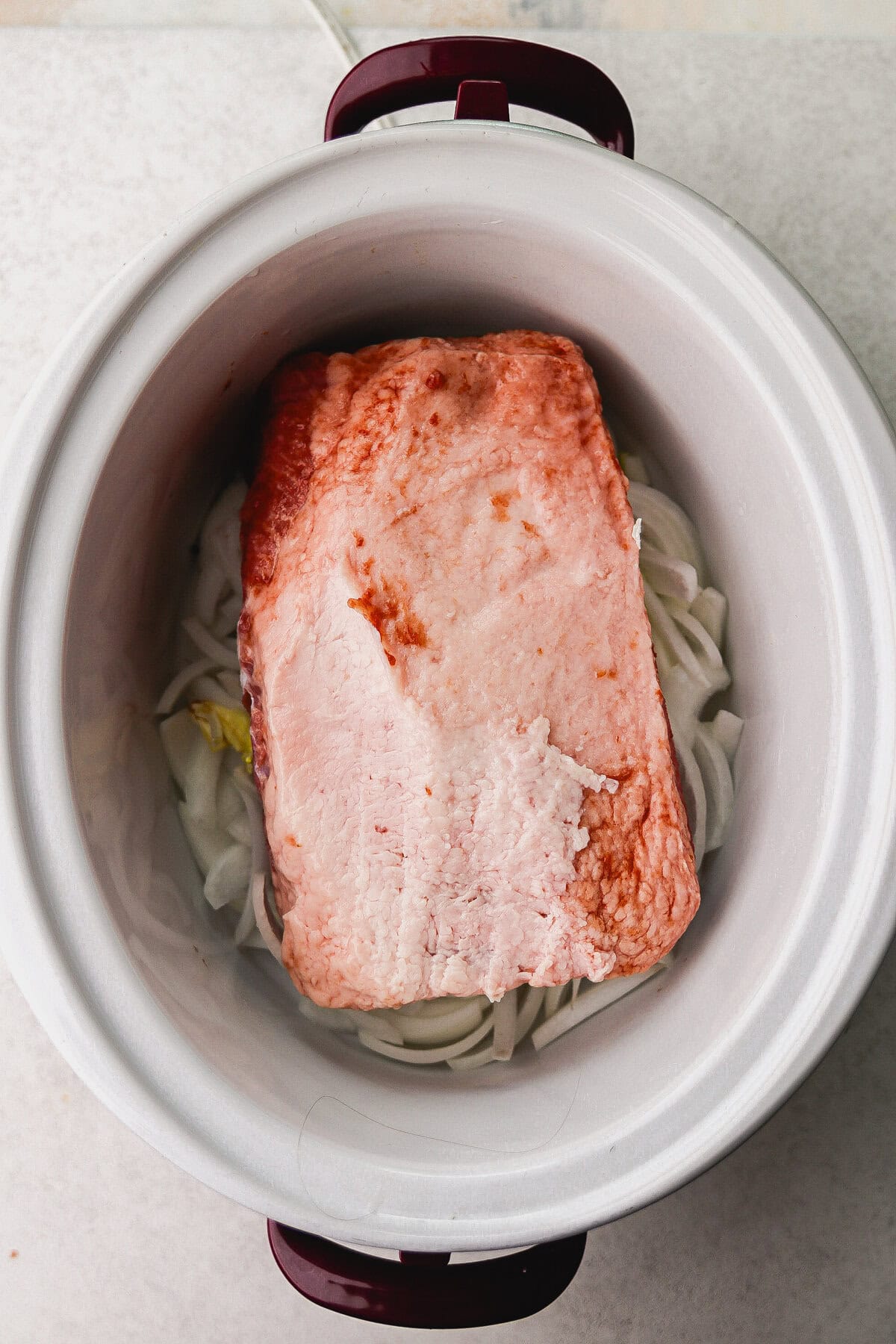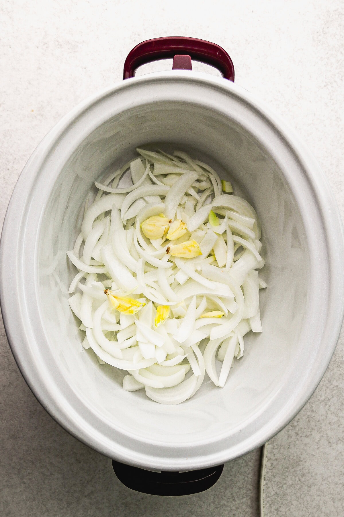 - Layer aromatics. Add the sliced onion and garlic to the bottom of the slow cooker. This adds flavor and creates a little “ledge” to lift the brisket slightly off the bottom.