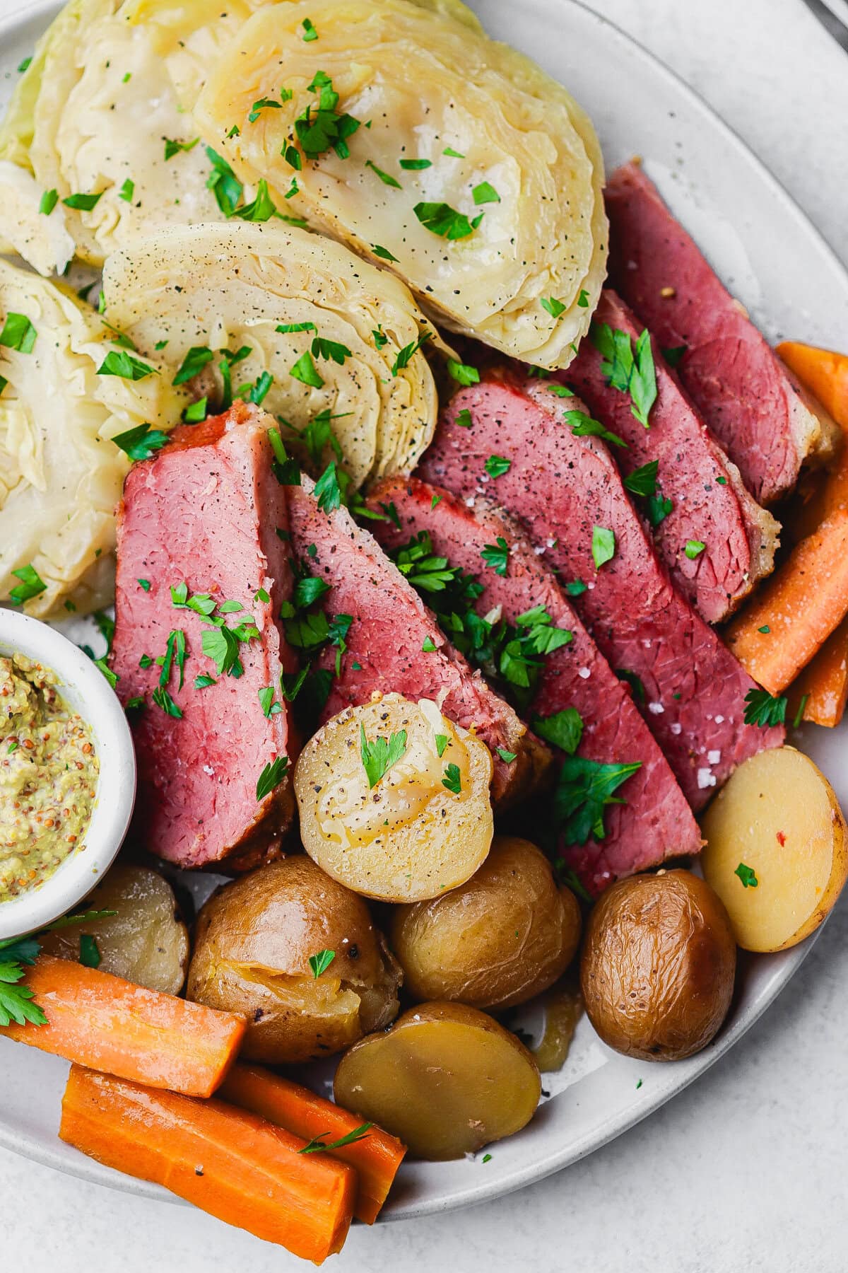 - Thinly slice corned beef against the grain and serve with potatoes, carrots and cabbage. Garnish with fresh parsley, if desired and serve with stone ground mustard and/or horseradish sauce.